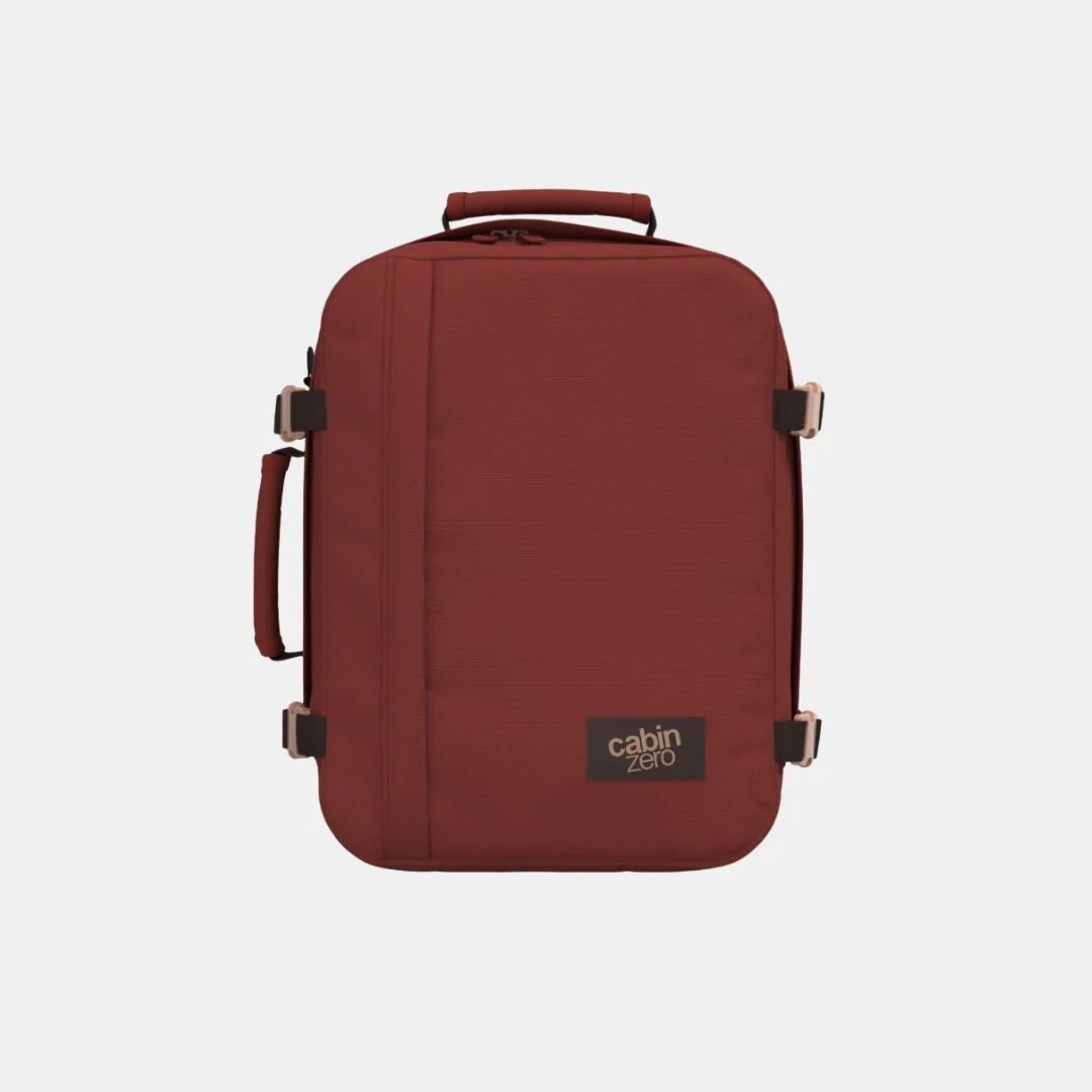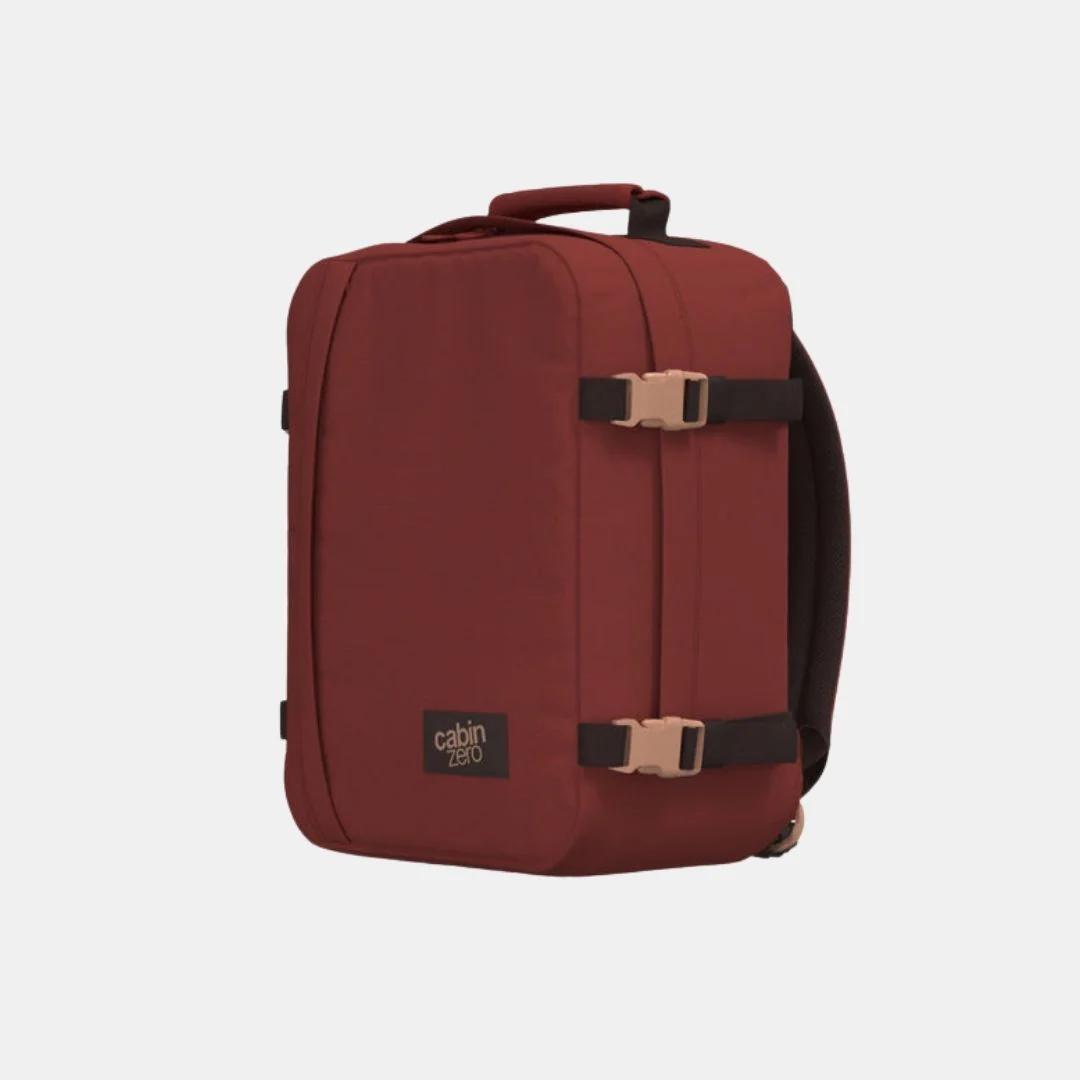 Keywords: mochila de viaje, Cabin Zero, mochila 28L, Sangria Red, mochila ecológica, mochila segura, equipaje de mano, mochila para aventura.